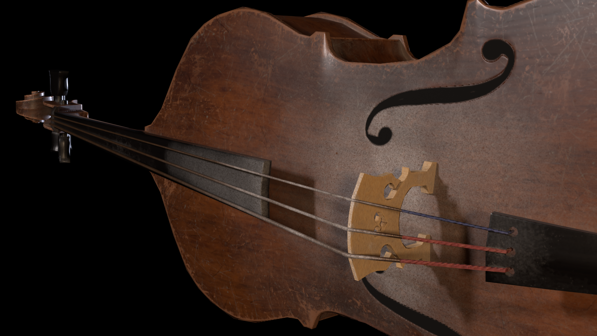 This model is based off of an 18th Century double bass. The two different textures represent the bass in its newest condition and the bass after it has been well used and maybe not maintained well enough. Both states of the bass use the same model that was created in Maya. The high to low poly baking was done in Substance painter, as was the texturing.